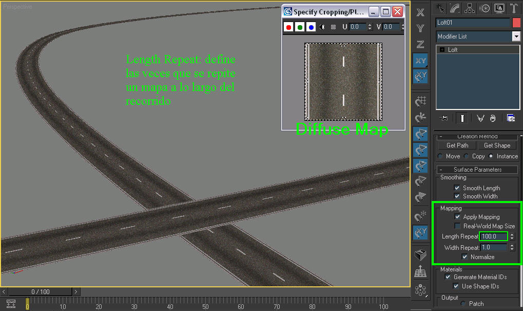 Para mapear con Loft simplemente se aplica un material con la textura que queremos, le indicamos las veces que queremos que se repita y esta seguirá el recorrido. Tampoco es complicado hacerlo mediante Unwrap, pero si un poco más lento.