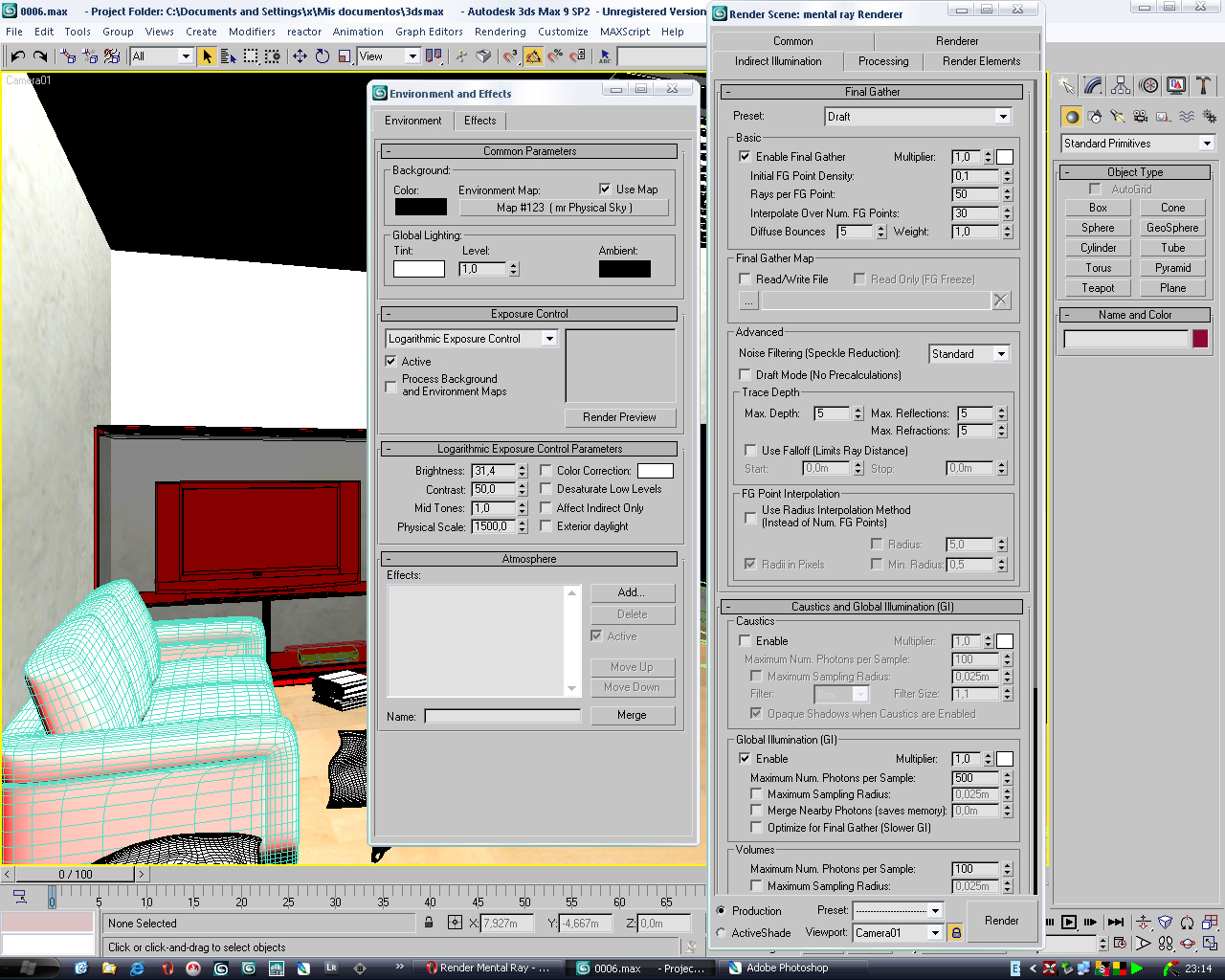 Hola, sí todo depende de la configuración de cada uno, pero lo que quiero lograr a esta altura, es que primero la iluminación de día está echa por una sola luz (sol) y la complementaria sería la de la envolvente, con Mental Ray logro este efecto, lo cual en Vray veo que se tienen que poner varias luces en las aberturas, para mí, las luces de un entorno tienen que ser lo más aproximado a la realidad, y no como en estudio de fotografía donde queremos dar una iluminación a un objeto ponemos varios tipo de luces, yo no veo que en un ambiente se pongan reflectores de varios tipo para lograr un escenario natural, la luz que proviene del sol al entrar por una abertura los cálculos de fotones, rebotes, tiene que ser dado por el programa lo más parecidos a lo natural, porque para una persona que recién se inicia en el tema de render, no tiene el ojo entrenado para ver detalles que otros sí, estamos en siglo XXI, mandamos un hombre a la luna, y todavía no tenemos software que emulen iluminaciones reales, repito en Vray vi varios ejemplos donde se llenan la escenas con luces complementarias, quedan bien, pero quien sabe si es correcto, la luz del sol es la que ingresa y de allí se encargara de dar la radiosidad en el interior y no las luces complementarias que le pongan.