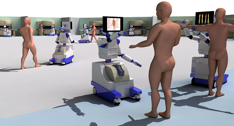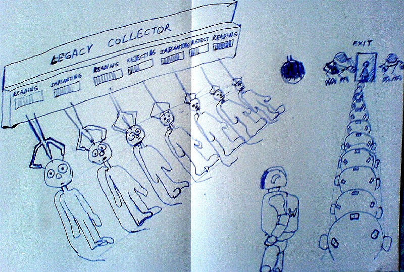 Desarrollaré una escena intermedia, en la cual las máquinas empiezan a capturar la composición física y Mental (recuerdos, conocimiento, experiencia, etc) de la población para unificar el legado humano en un único superprocesador central.