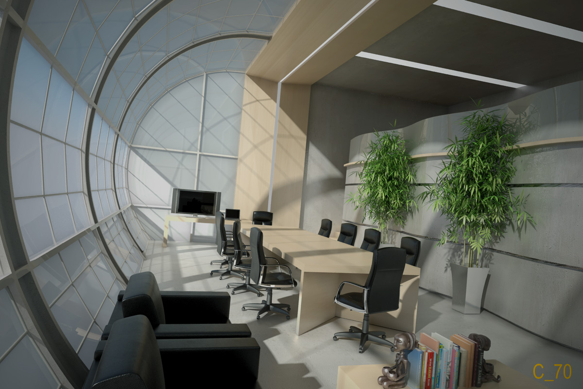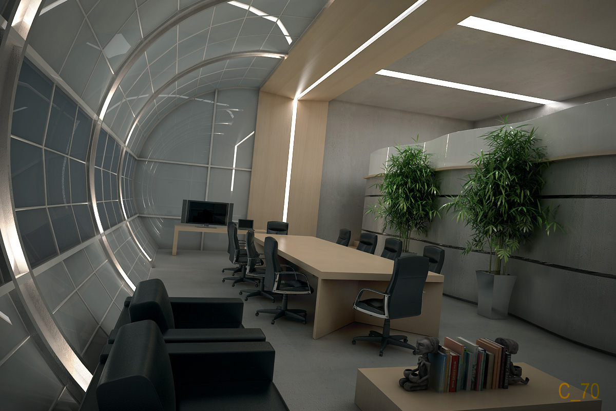 Me gusta mucho la imagen, pero en mi opinión haría falta una imagen de fondo ya que ese gran ventanal lo pide a gritos, para darle mayor realismo pondría una fotografía de rascacielos como dice el compañero halcón;siempre puedes difuminarlo un poco para que no cante mucho, también pondría un poco de Dof ya que el punto de fuga de la perspectiva, cónica queda un poco alejado del objetivo y le da mucha profundidad a la escena así que, con un poco de Dof quedaría chulo. Felicidades buen trabajo, saludos.