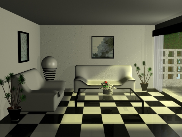 Hola a todos de nuevo. Otro render del salón. Poquito a poco va mejorando. Sigo estudiando lo de la iluminación, que no gusta nada, y pregunto:¿por qué se refleja la maceta en la cristalera si lo que hay es una cortina? Agradezco vuestros comentarios.