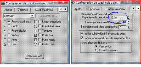 Ahora nos vamos a la vista superior (top) y le damos clip izquierdo para seleccionarlo y en clip para agrandar la vista. Después clip conmutador de ajuste para dibujar unas líneas que nos corran por los cruces de las cuadrículas, clip derecho sobre este mismo conmutador para establecer el espaciado de las cuadriculas a 0,10m y ajustarlo a los puntos de la cuadricula.