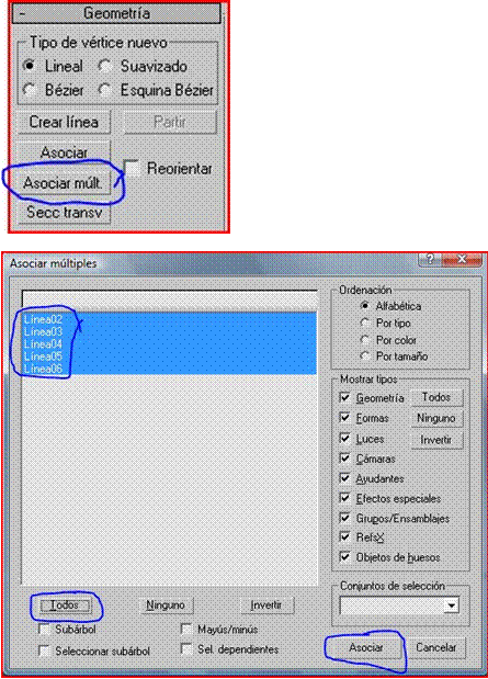 En este momento todas las líneas están separadas por 10cm que es el grosor normal de las paredes, las splines son entidades que no están relacionadas entre sí, pero queremos que en conjunto formen las paredes de nuestra casa o cabaña, por lo tanto vamos a seleccionar las paredes exteriores Archivo adjunto 232716 vamos al panel modificar Archivo adjunto 232717 en la sección de geometría apretamos en el botón asociar múltiple, en el panel que nos sale apretamos en todos y después en asociar.