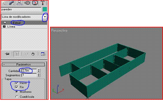 Esto no se parece para nada a unas paredes por lo tanto desplegamos la lista de modificadores, seleccionamos extrudir y le damos una cantidad de 2,5m que es una altura normal para una casa, escogemos tapa al inicio y al fin para que las paredes no se vean cocas.