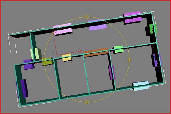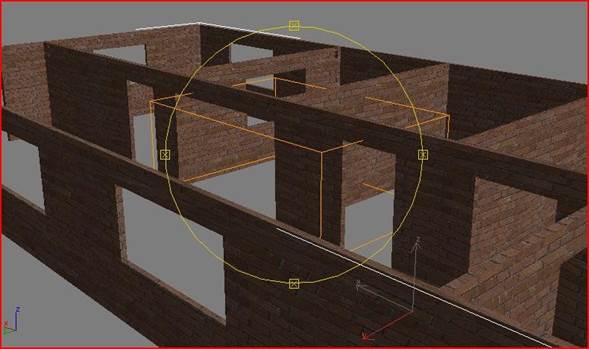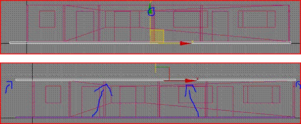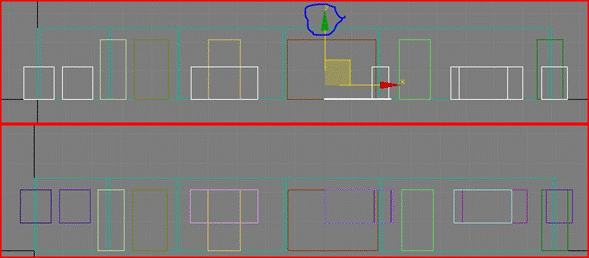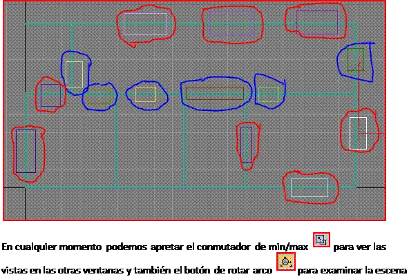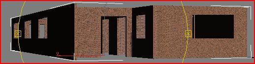 Ahora en la vista superior apretamos en el botón de seleccionar y mover Archivo adjunto 232730 y con la tecla control presionada empezamos a seleccionar todas las cajas que harán las veces de ventanas, seguidamente si no están las cuatro vistas visibles apretaremos el conmutador de min/max y aremos clip con el botón derecho del ratón en la vista frontal para que no se nos deseleccionen las cajas, y cogeremos el haza verde que representa el eje Y para mover todas las cajas al mismo tiempo de forma que le calculemos que la parte superior de las ventanas queden a la misma altura que la parte superior de las puertas.