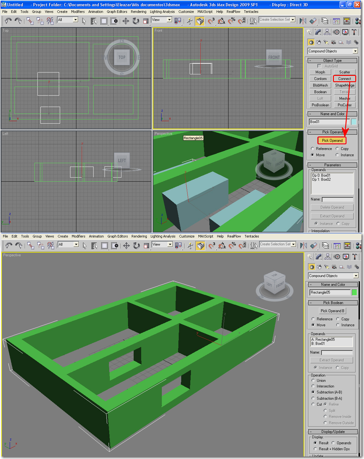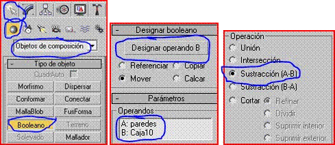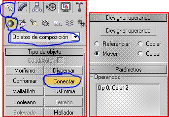 Os cuento lo que hago, selecciono una caja como dice, voy a geometría luego a compound object y pincho en connect, se me abre el menú, hay que hacer algo aquí? Porque dice seguidamente en designar booleano apretamos designar operando b (supongo que, todo esto será pinchando antes en bolean?) luego hay que seleccionar las demás cajas para que se forme una sola unidad, las selecciono, pero ya se me desactiva el menú de las booleanas.