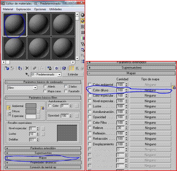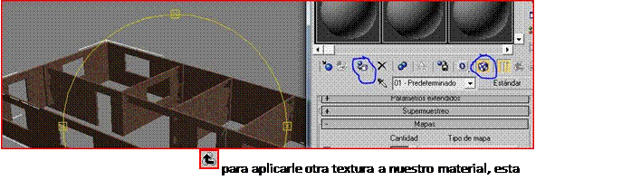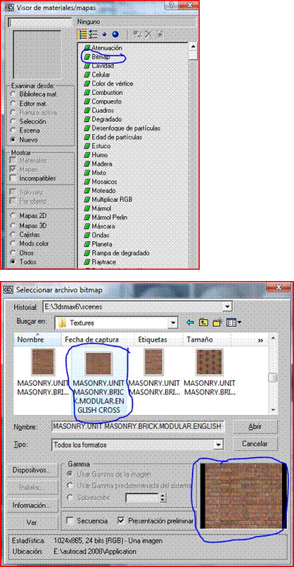 Nos vamos directamente al editor de materiales seleccionamos una cuarta casilla, desplegamos la lista de mapas, sobre color difuso apretamos en ninguno, doble clip en bitmap y buscamos nuestro material.
