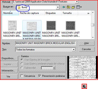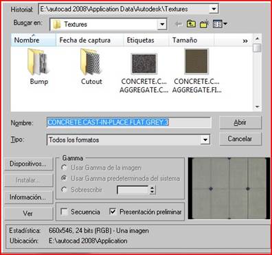 Apretamos sobre bitmap y buscamos en nuestro disco duro una textura que nos sirva, en este caso la saque de la biblioteca de Auto CAD 2008.