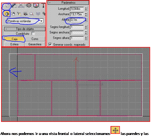 Ahí están las paredes de la casa pero sin los huecos para las puertas y ventanas, para hacer estos nos vamos a la vista superior, vamos a crear<geometría<primitivas estándar<caja, y creamos tantas cajas como deseemos en donde irán las puertas y ventanas. A las que formaran los huecos para las puertas le daremos una altura de 2,08m y a las que formaran los huecos para las ventanas le daremos una altura de 1,15 naturalmente usted puede variar estas medidas, y colocar las puertas y ventanas como mejor se acomoden a su diseño, en mi caso las coloque así, en la imagen las cajas las cajas señaladas con azul representan los huecos donde irán las puertas, y las señaladas con rojo representan los huecos donde irán las ventanas. En este momento podemos apagar el conmutador de ajuste Archivo adjunto 232723