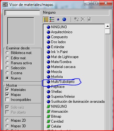 Ahora trabajemos sobre el material del piso, para esto seleccionamos la caja podemos cambiar el nombre por piso, abrimos el editor de materiales escogemos la segunda casilla, desplegamos la lista de mapas y apretamos en asignar material Archivo adjunto 232794 después doble clip en multi/subobjeto.