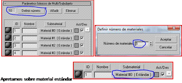 En los parámetros básicos del multi/subobjeto apretamos en definir número y en la pantallita escribimos 1.