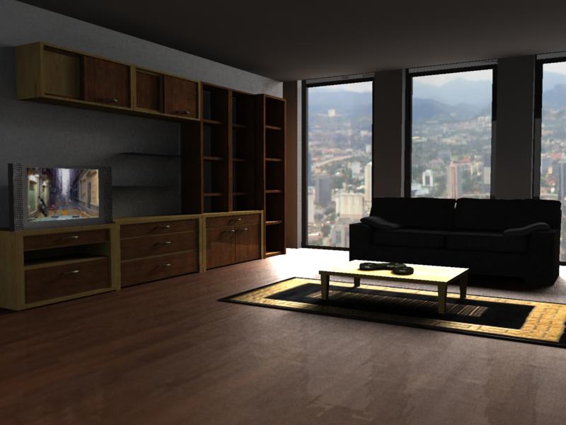 No está mal, pero el fondo lo veo demasiado iluminado. También el sofá con un poco de sobrealtura. Me gusta el diseño de la alfombra. En adelante ira mejorando. Un saludo.