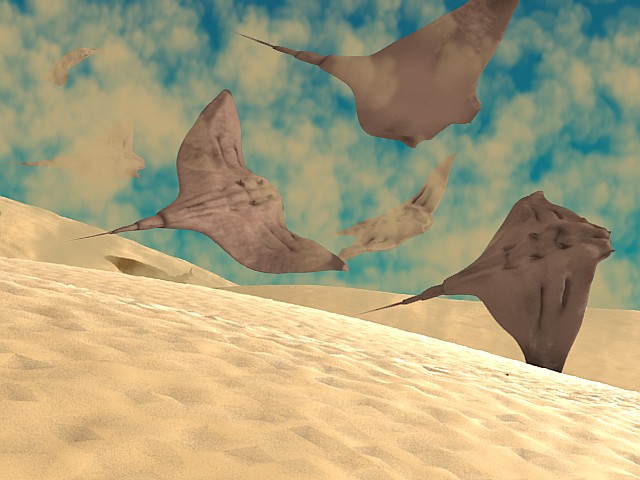 Allá va, no la he terminado aún, aunque no creo que de ningún cambio radical. Blender 2.44, motor interno. Displacement y Bump para la arena, partículas con sprites para el polvo y un poco de s (aunque no sé si se nota) para las mantas. Un saludo.