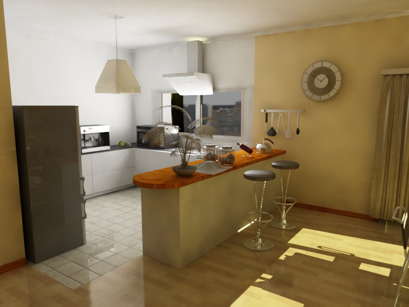 Personalmente me parece que hay luces mal distribuidas y que eso puede estar afectando algunos materiales, creo que en términos del GI no está tan mal, pero no entiendo por qué hay luces donde se supone que no debería, por ejemplo, me da la impresión que en la 2ª fotografía en la lámpara que cae del cielo tiene una luz, si es así no tiene sentido incluirla porque la ambientación se supone de día y con luz entrando por los ventanales. Así mismo en la campana (extractor de aire, no sé cómo le dirán ustedes) hay reflejos que no concuerdan con otros objetos (como el microondas) y además tiene una luz en su parte superior, con todo esto quiero decir que tal vez tienes más emisores de los necesarios y si los quitas tal vez soluciones en parte el problema. Saludos.
