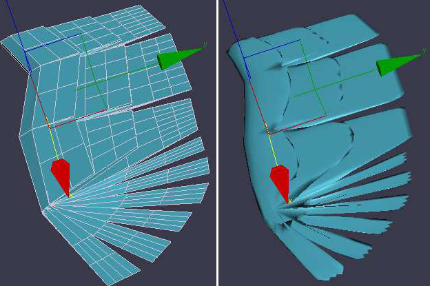 Así que ha seguir probando. Edito: probablemente si hubiera dispuesto los huesos como tú, la malla se habrá deformado mucho menos. Prueba así a ver, con esas caras separadas. Para hacer que las plumas se sobrepongan, bajas un poco los huesos de los planos de esas plumas y ya está.