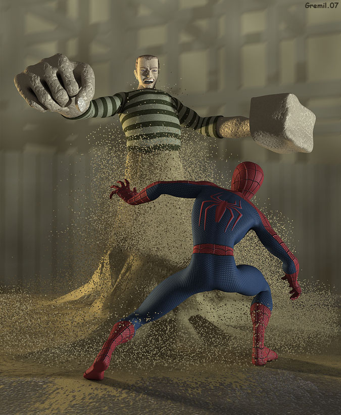 Sigo con cosas relacionadas con Spider-man, en este caso se trata del hombre de arena. En principio quería modelar a escorpión, pero me propusieron hacer al arenoso ya que esta de actualidad y a eso me he dedicado, he realizado dos tipos de acabado, un render con Vray y el otro con Final Toon, el gráfico que conforma la portada está hecho en Corel Draw, el montaje final en Adobe Photoshop, donde además he subido la intensidad de color del hombre de arena para adecuarlo más al resto de la escena.
