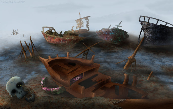 Cuentan los marinos que existe un gran cementerio de barcos en la superficie del atlántico que contiene barcos de todas las edades de la navegación humana, capturados e inmovilizados en campos de algas y sufriendo una lenta descomposición, pero gobernados todavía por tripulaciones de esqueletos integradas por los infortunados que no consiguieron escapar y debieron así compartir el destino de sus navíos.