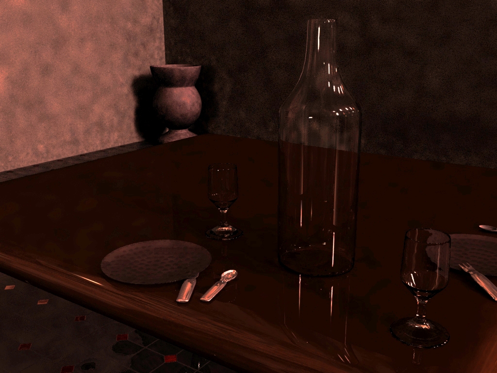 También yo centraría la iluminación en los objetos como cubiertos y cristales quizá utilizaría el estilo de los bodegones que suelen oscurecer los fondos y centrar todo en lo que se quiere mostrar si el render que utilizar y el Blender te lo permite estaría estupendo poder jugar con los pases, canales y sombras.