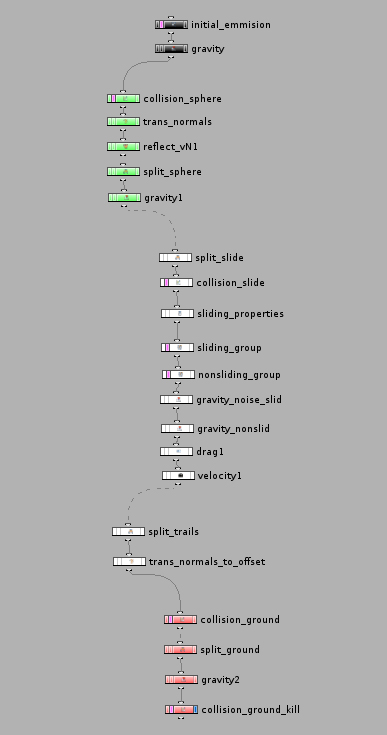 Ya he visto la escena, eso es justo lo que buscaba. (aunque ahora me pica la curiosidad de hacerlo de la otra manera). Una pregunta acerca del attribute transfer, a ver si entiendo cómo funciona exactamente (por lo que he visto en la ayuda es así, pero quiero confirmarlo). La partícula choca con la esfera, le pregunta al attribute transfer que normal le corresponde de todas las que tiene la esfera, y éste mira a ver en qué punto de ésta ha colisionado, y hace la media de las normales próximas a ésta, según los parámetros que le pongamos, ¿correcto?