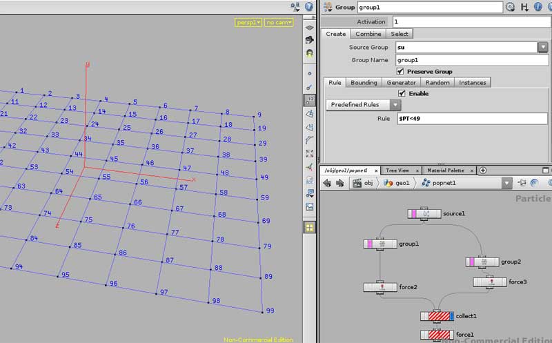 -Un nodo source, que crea un grupo su con $preserve activado (todos lo tienen activado). Crea 100 partículas sobre un grid de 100 puntos.