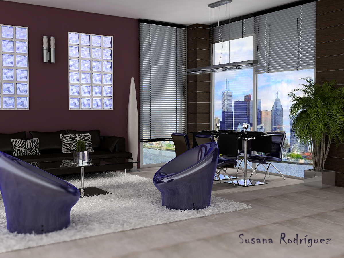 Pues si coincido con Gremil, me gusta mucho la alfombra, y yo creo que las luces están apagadas, ¿no? De lo contrario deberían arrojar luz sobre las paredes y demás objetos como bien dice xicogarrido, por otro lado, la lámpara de la mesa de comedor la veo un poco grande con respecto a los muebles, y las sillas quedarían mejor en su versión original de Rolf-benz, te dejo un enlace por si no lo has visto. Rolf benz.