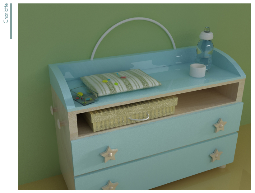 1.- Creo que le has puesto demasiados reflejos a la zona azul dónde está el biberón y demás.