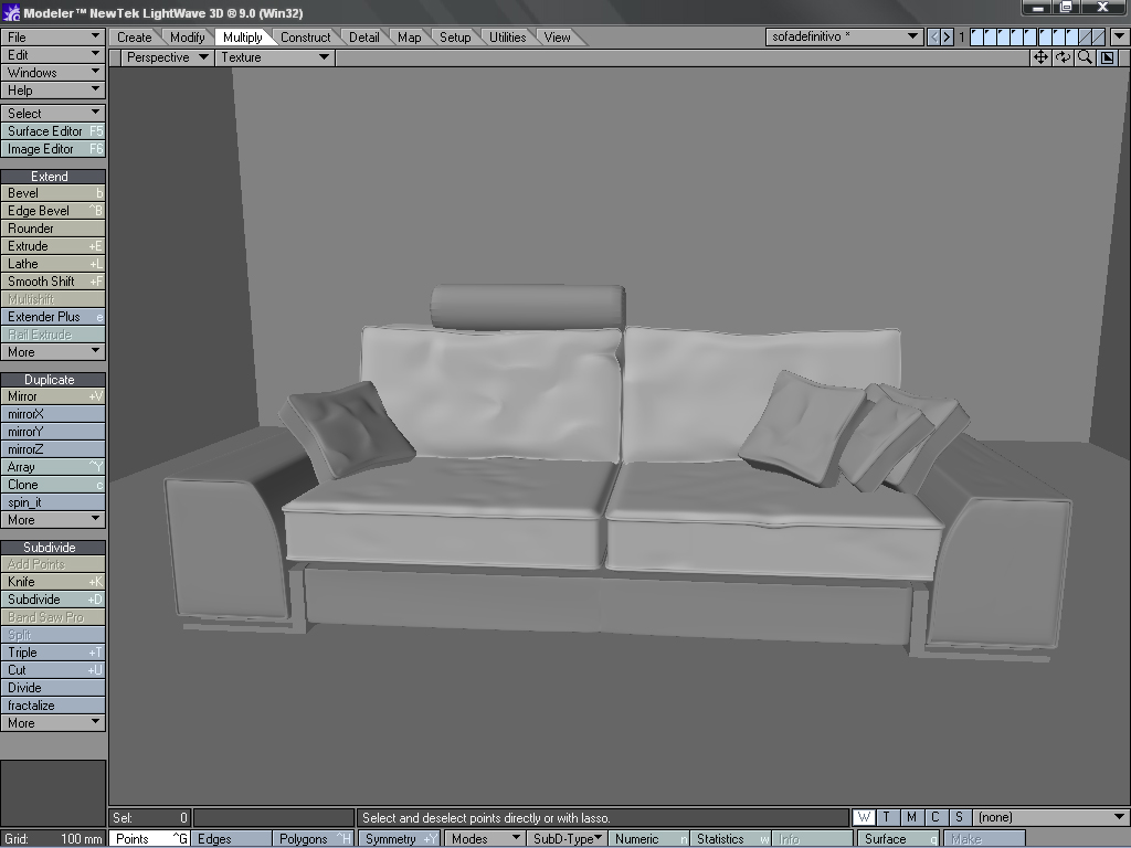 Que va si no tiene noise ni nada. Solo una imagen es un render, las demás son del modeler y un par del resultado que busco. Ahora estoy probando con una imagen para el Bump que simule la rugosidad del cuero, para los pliegues no sé si modelar o poner texture displacement, ¿alguna recomendación para que quede lo más fotorrealista posible? no me sale el cuero socorro echarme una mano, o el brazo o algo, o algún tutorial o hay texturas gratis de cuero ya hechas? Si no algún DVD que me recomendéis de texturas para muebles/interiores, cueros, maderas, metales, cristal, paredes. Es que veréi, yo solo he de modelar los objetos, pero el cliente quiere ver una muestra del resultado que se puede lograr y no sé porque sino es mi faena me lo han endosado a mí, voy de culo y apenas tengo tiempo.