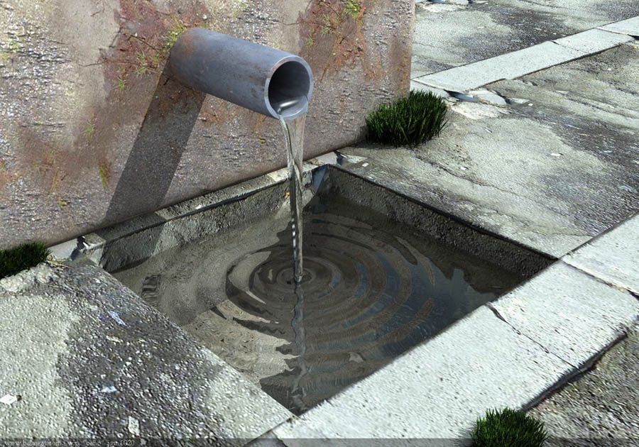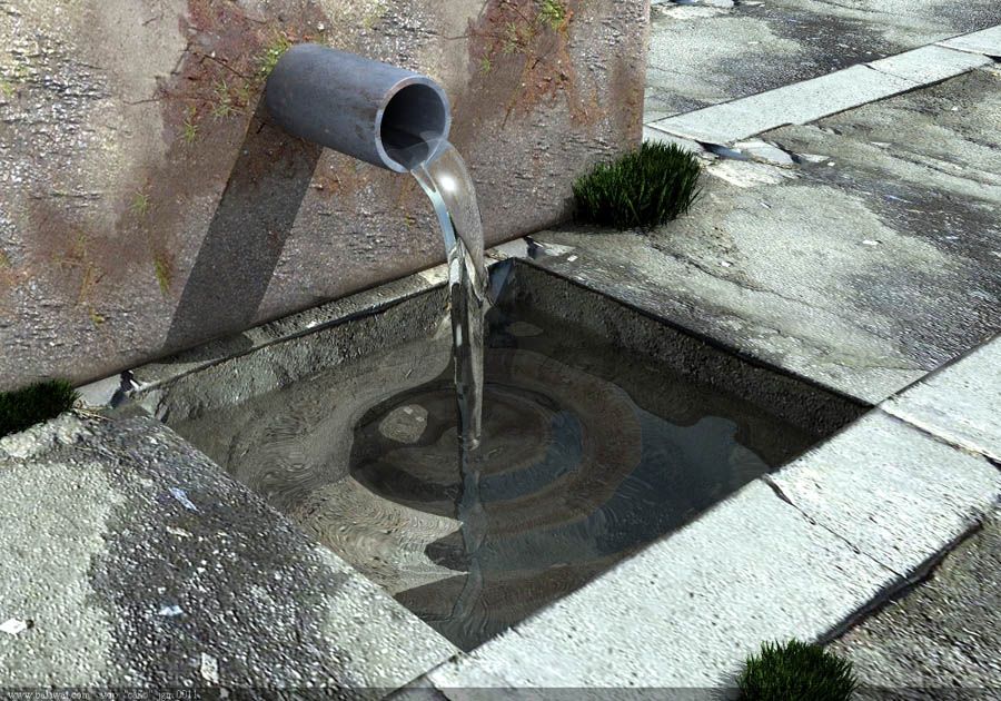 Dos cosas, una muy buen render. La otra una crítica. Si quieres simular agua, al caer el agua debería de estar más agitada, así parece vaselina liquida u otro tipo de aceite espeso, pero la textura está muy bien. Ya sabes el agua de abajo más agitada (con olas, ya que el chorro que cae es grande) y la que sale del tubo no tan cilíndrica (tipo pasta de dientes). Pero lo dicho muy buen render.