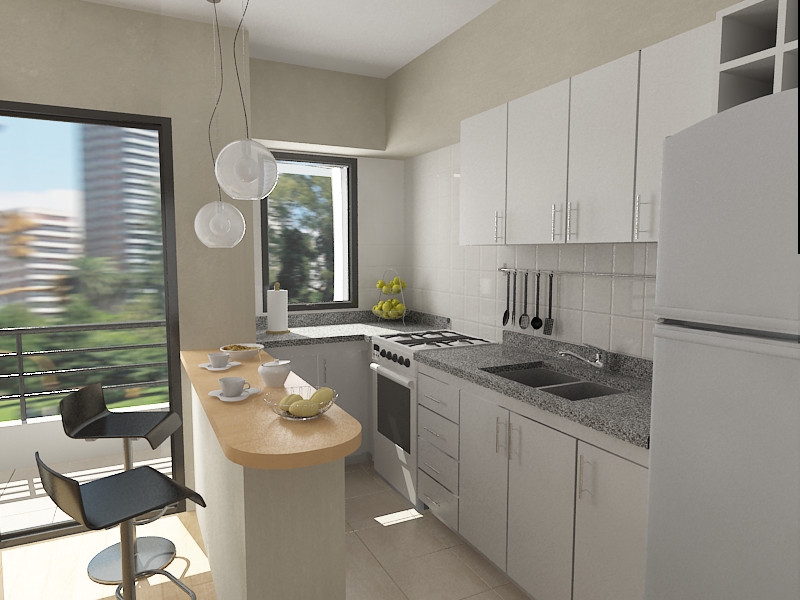 Está bastante bien, aunque los edificios del fondo parece que llevan prisa. Los muebles, que supongo blancos, están demasiado grises, sobre todo la nevera del primer plano. Saludos.