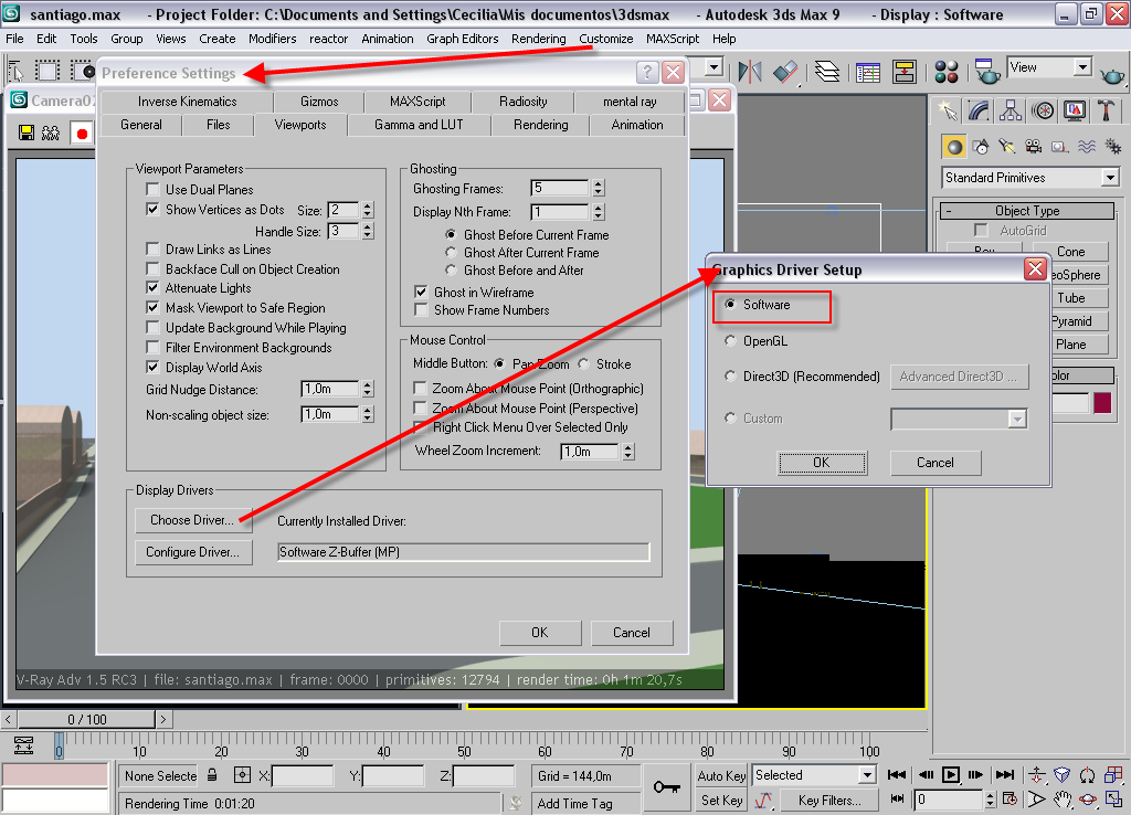 Respondiendo a tu consulta, supongo que, el problema era que no había configurado el programa para mí tarjeta de video, pero sinceramente tenía desconfianza del 3ds Max 9 pues no conozco a nadie que lo use y los pocos que lo probaron tuvieron problemas y me aconsejaron volver al 3dsMax 8 pues ya sabemos que anda todo bien, así que, finalmente formateé el PC y así pude volver al 3dsMax 8 sin más problemas. Saludos.
