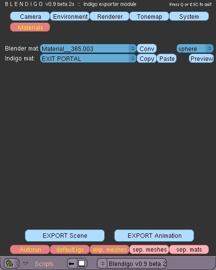 La escena no contiene los materiales de Indigo, tienes que definirlos con el script. Cuando lo ejecutas, el trata de generar las mejores equivalencias con el material que has definido (si los actualizas deberás pulsar el botón conv para que lo haga él), pero siempre hay que revisarlos. En concreto, el material que define el portal lo tienes que definir como te he dicho antes.