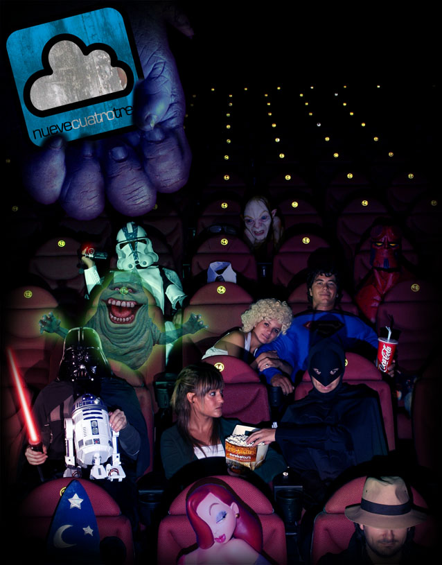 Completamente de acuerdo con lo de la suela, un fallo imperdonable, pero bueno. Y, de lo segundo use dos flashes detrás de la cámara simulando la luz que tendría la pantalla si estuviera encendida, pero el punto fuerte seria lo friki que sería la fotografía.e, supuestamente miran a cámara porque están viendo la película, no sé si el efecto esta conseguido, yo creo que sí.