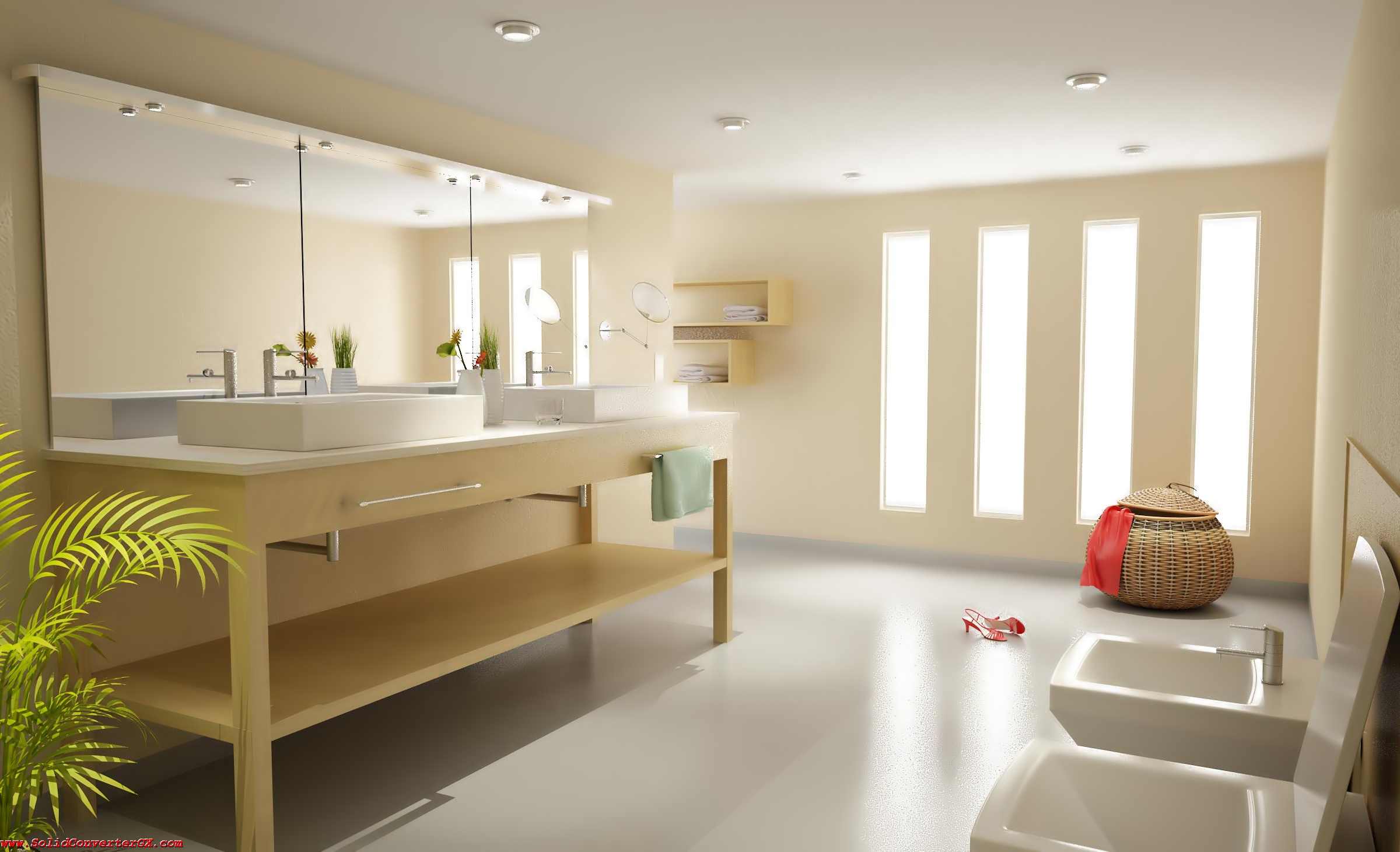Esa planta está en la entrada del baño, creo que no es correcto porque interrumpe el paso natural, parece que la pusiste en postproducción, creo que no cuadra mucho con el resto.