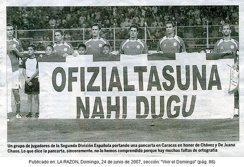 En la fotografía aparece ofizialtasuna nahí dugu qué significa queremos la oficialidad, en la nota pone un grupo de jugadores de segunda división española portando una pancarta en Caracas en honor de Chávez y de Juana Chaos. Lo que dice la pancarta, sinceramente, no lo hemos comprendido porque hay mucha faltas de ortografia.