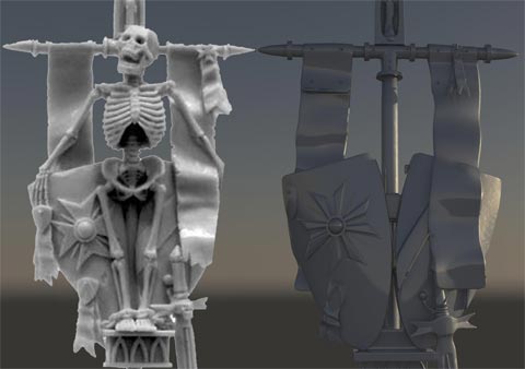 Bueno, otro pequeño (gran) avance. He terminado el estandarte (faltaba el esqueleto y detalles por todos lados), la cabeza y la porción del torso, la buena noticia es que me encanta como me han quedado estas últimas partes, la mala (al menos para mí) que voy a rehacer el brazo y las hombreras porque he aprendido a modelar mucho mejor, y quedarán más limpias de polígonos y mejor de forma.