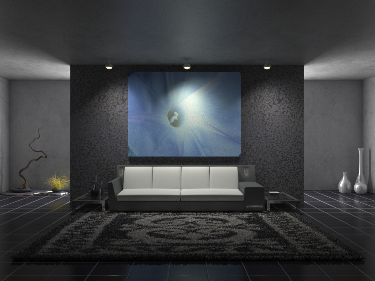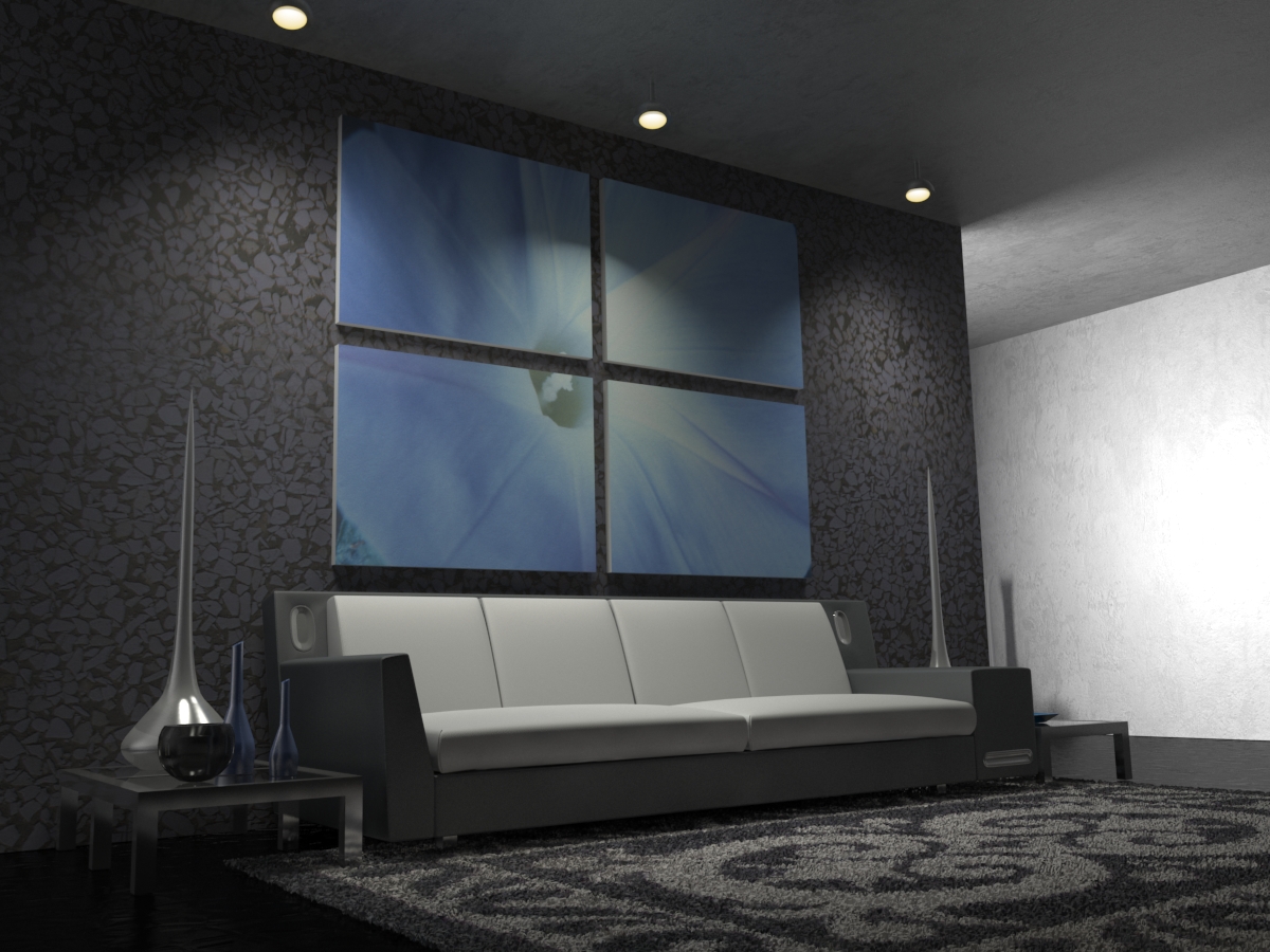 Gracias a todos por sus comentarios. En cuanto a la sobre exposición del cuadro, mira este otro ángulo que dejo aquí, no es que esté sobre expuesto, la imagen del cuadro es así y da esa sensación. La alfombra es un plano con un material Vray aplicado con Diffuse una imagen de una alfombra y con displacement (tradicional, no vraydispalcement) muy bajo, apenas un 10, utilizando una imagen bastante ruidosa tipo arena sin saturación. Ciaho (creo que se llama así) creó este material en vraymaterials, de y me parece que es genial porque es muy sencillo, pero da un buen resultado, además no toma mucho tiempo para renderizar.