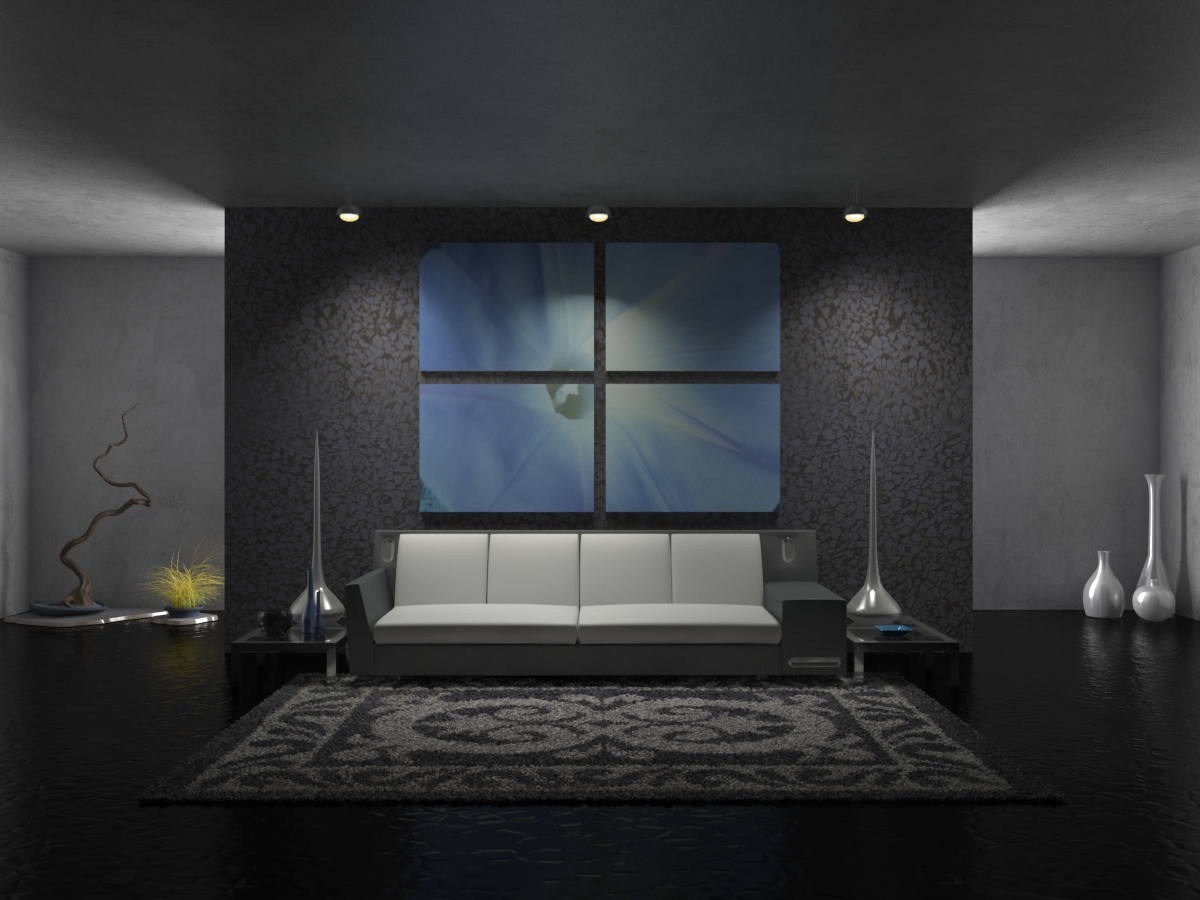 Como infografía no está mal. Los materiales por separado me gustan: la alfombra, la pared estampada, los jarrones y el cuadro. Sin embargo, al ponerlos juntos algo no cuadra. Parece que se te han ido de escalas los mapas. Da la sensación de que la alfombra es demasiado grande y espesa o el sofá tiene unas medidas que no corresponden a un sofá de 4 plazas, el ruido del cuadro es exagerado y grande, y las llagas entre baldosas también. Las mesitas tan bajas flanqueando al sofá no ayudan y la elección de una perspectiva central tampoco, ya que, con tanta simetría se perciben mejor los defectos.
