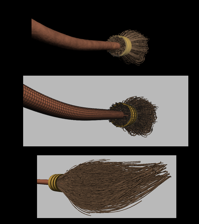Están basadas, por supuesto, en las de las películas de Harry Potter. La primera es una imitación de la nimbus 2000. Me ha inspirado el trabajo de garman herigstad para la primera película. En la web de su escuela tiene un vídeo que usó en el Siggraph sobre el modelado de los cepillos. Su técnica es muy útil, aunque no me gustan ciertas cosas que hace (complicarse la vida) y he seguido mi propio camino.