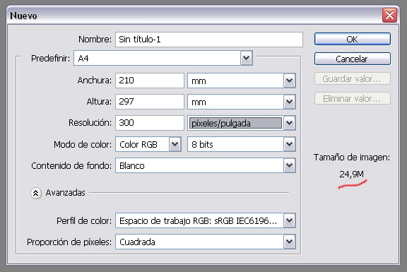 Te recomiendo que para enterarte bien de este tema abras un nuevo documento de Photoshop. Vamos a abrir un documento tamaño a4 a 300 dpi, veras que la cantidad de información que ocupa es unos 24 megas.