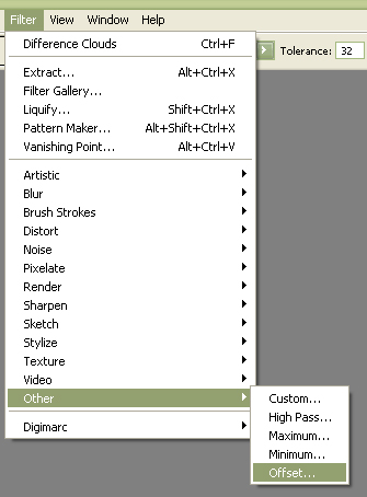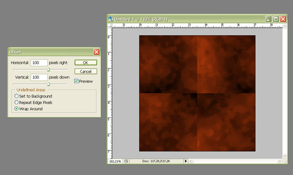 Dentro del menú filter/other (imagen_03) elige offset, y pon unos valores tanto en horizontal como en vertical que correspondan a la mitad (no tiene por qué ser exacto, es solo por comodidad) de tu imagen. En mi caso como escogí una imagen de 200 por 200, pues escribo 100 y 100 en ambas casillas, como verás al aceptar aparecerá una especie de cruz en el centro (imagen_04). Esa cruz no es más que lo que eran antes los bordes, colocados ahora en el centro (ya que este filtro lo que hace es desplazar la imagen), lo que hay que hacer con un poco de maña y paciencia es mediante la herramienta de clone stamp (tampón de clonar) o lo que tú quieras, deberás suavizar esa cruz central de forma que no se note (imagen_05).