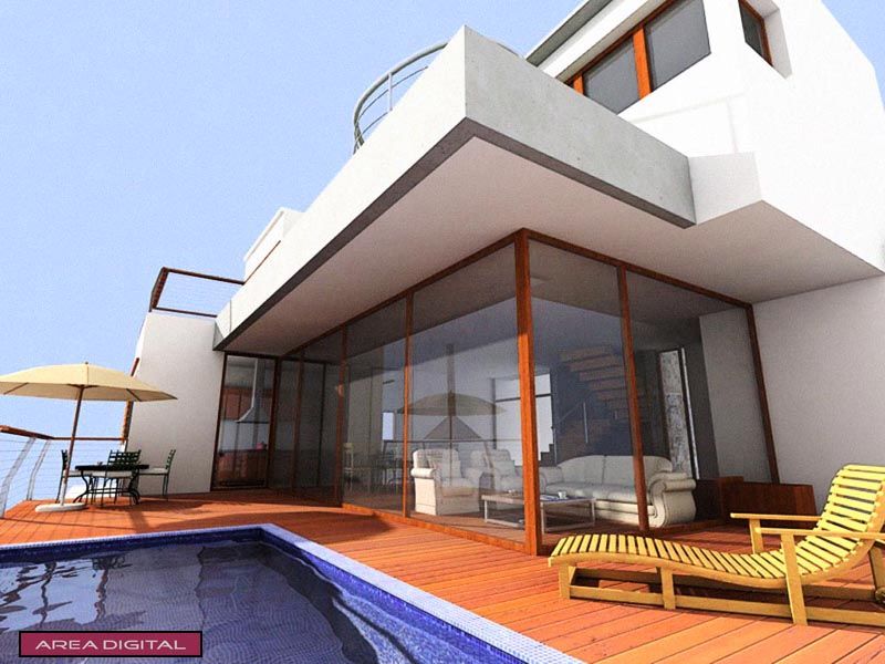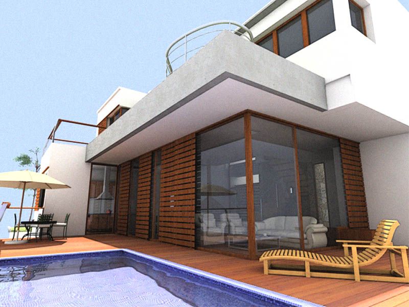 Dos cosas: A) las cáusticas del fondo de la piscina no me molan nada, quedaría mejor que le aplicaras directamente un mapa de cáusticas de esos que ya vienen por ahí hechos, así mismo, si haces reflejar contra el saliente del techo del chalet esas mismas cáusticas le darás un toque mucho más cool (y realista).