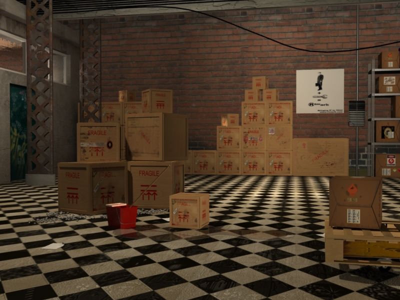 Una cosa que no te han dicho: los ladrillos de la pared están desproporcionados con el tamaño general de las cajas y del almacén. Coincido con Lummox sobre el suelo. Hay que desordenar todo un poco más, el cable de la pared es negro y mate, se te van los ojos a él.