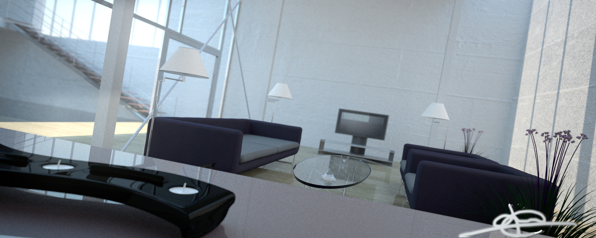 Cierto, mejor menos ruido, y hay algo que veo raro en la mesa, la veo como demasiado enfocada para lo difuminados que están los bordes de los sofás, la veo demasiado nítida, a lo mejor un poco desenfocados los cantos del cristal quedaría mejor. La imagen es interesante, pero creo que se le puede sacar mucho más partido. Aun así, creo que es un buen trabajo.
