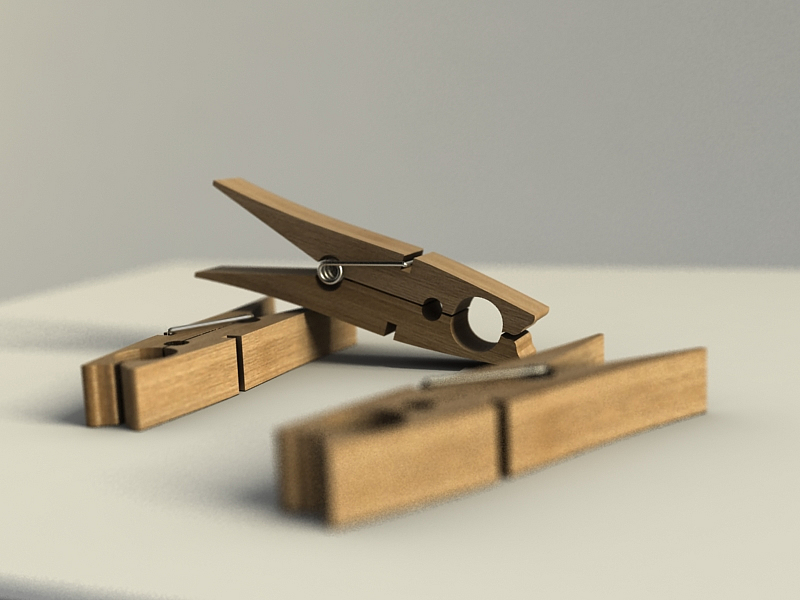 Pues no están mal, las texturas están bastante conseguidas y la iluminación es correcta. En general pese a la gran simplicidad de la escena, me parece un render bastante decente, el gran, pero es el desenfoque de la pinza más cercana a la cámara, que creo que te has pasado un poco-bastante, o para seguir con el tema, se te ha ido un poco la pinza.