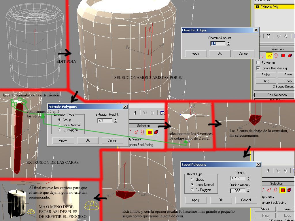 Hola a todos, pues estoy intentando hacer algo tan sencillo como una vela, bueno, la vela más o menos me sale, lo que no consigo que me salga medio decente es la cera que suele quedarse derretida alrededor de la vela. He hecho varios intentos pero se queda fatal, parece una vela con elefantiasis y la verdad no tengo ni idea de cómo hacerlo, a ver si sabéis de algún tutorial que explique eso u otra cosa pero que sirva para eso mismo. Pues nada más, un saludo.