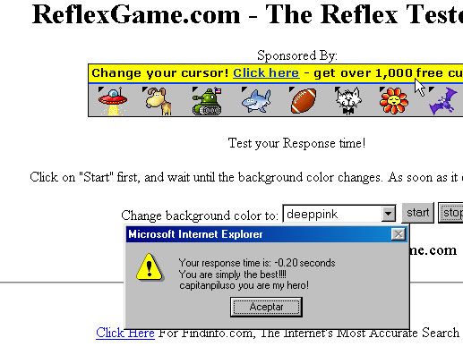 Dale al botón start, espera hasta que el fondo cambie de color y dale a stop. 0.15 es mi mejor puntuación, a ver cómo lo hacéis. http://reflexgame.com/.