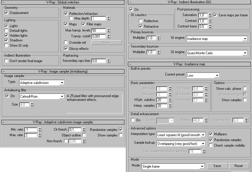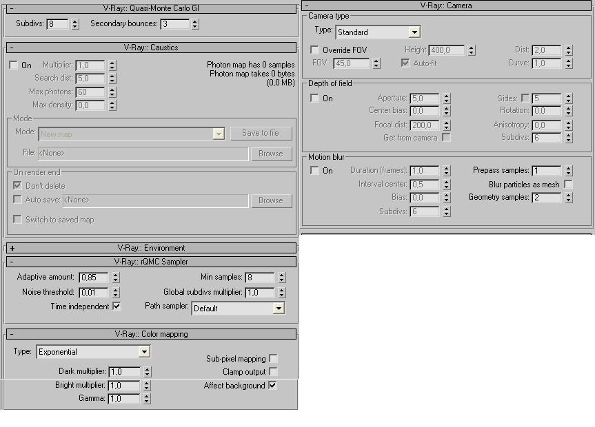 Bueno, en primer lugar deberías subir las hsph a 50 o 60 y las inter a 30 o 40, 60/40 son un buen número para mí la mayoría de las veces. Por otra parte, prueba a utilizar un valor de 0,005 en el noise threshold del randomized Quasi Monte Carlo, así mejorara un poco la escena en general.
