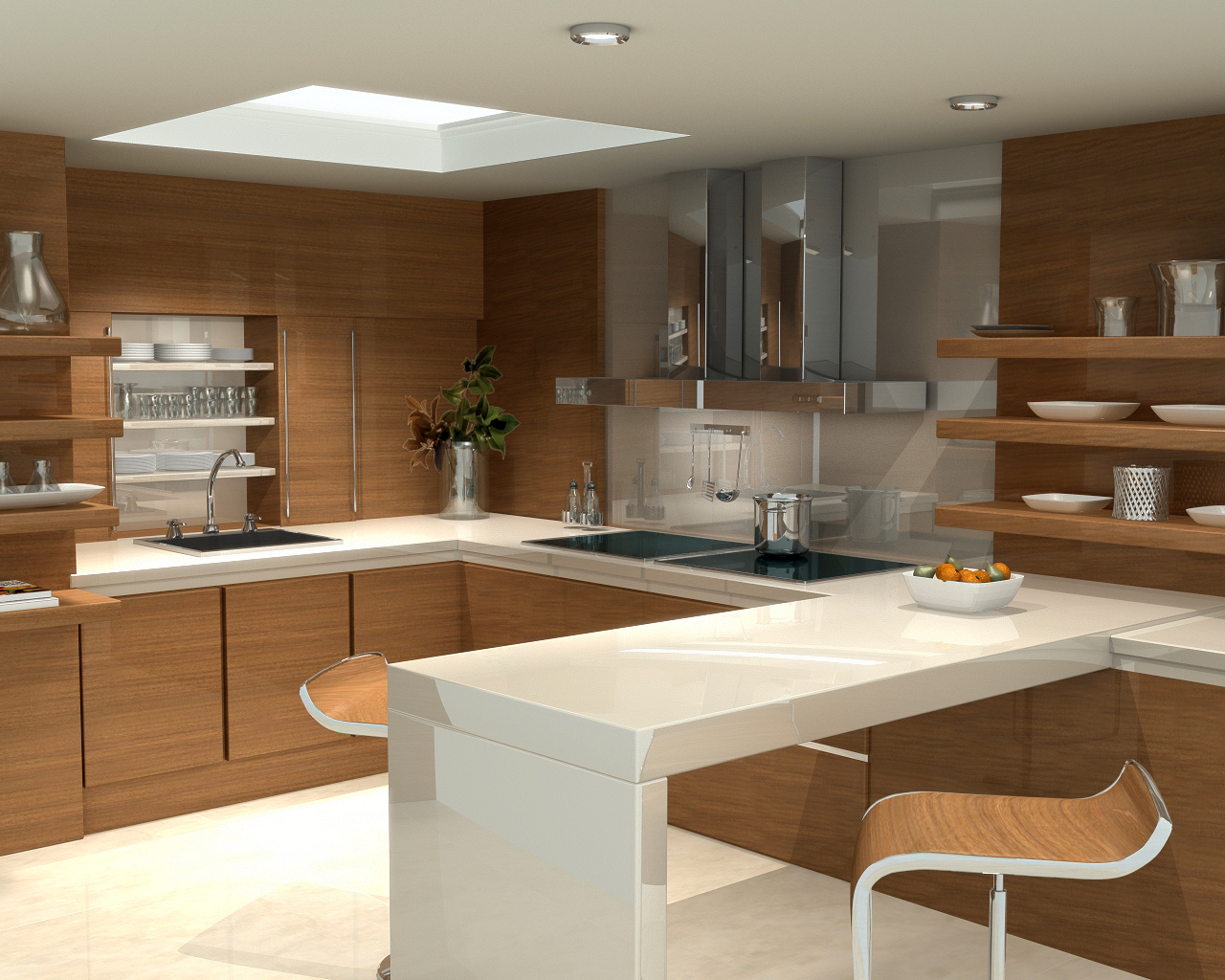 Me parece que deberías bajar la reflexión en casi todo menos en las cerámicas y en algunos metales: me da la sensación que hasta las maderas reflejan más que el suelo, vamos que es lo que menos refleja en la escena y debería ser de lo que más, ¿no? Lo de detrás de la vitrocerámica si es un espejo bien sino, demasiado don limpio.