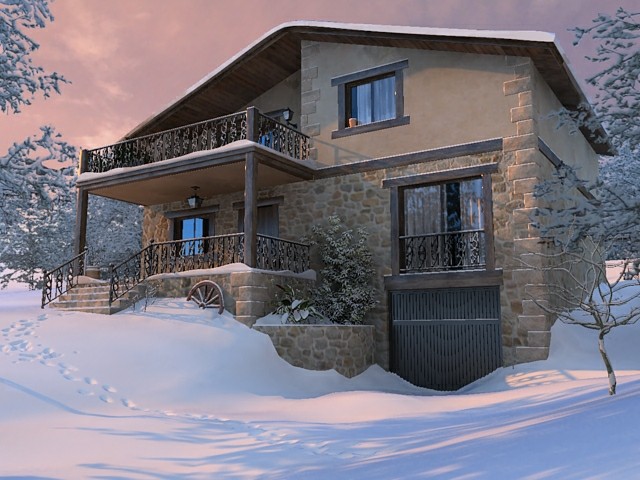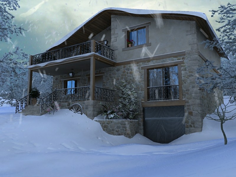 Gracias carlosall. Los árboles de fondo y de los laterales son mapas planos de árboles nevados. Las plantas y el árbol 3d de la derecha dupliqué la malla desplazándola hacia arriba un poco y dándole el material de nieve.