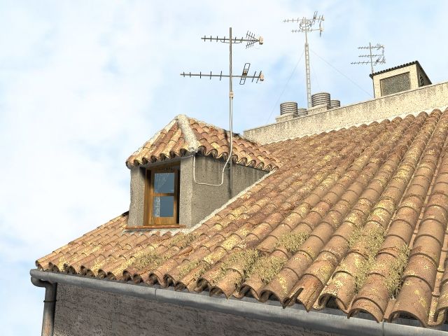 Además de lo anteriormente dicho por mis compañeros: las tejas y la textura de la fachada de la caseta o buhardilla se ve que están escaladas negativamente respecto a las otras. Además, tendríais que haber dado un poco más de holgura a las tejas, para que no de la sensación de ser demasiado planas y excesivamente pegadas una sobre otra. ¿dónde habéis visto que los cables de las antenas cuelguen por las tejas? Eso lleva una instalación por los bordes del tejado y cae sobre la fachada donde las tejas no hacen ala. (esto último es una gilipollez. Pero es así). Un saludo, aguantad el tipo, que este es el camino.
